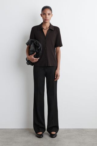 Elevating her outfit, the actor layered a dark black single-breasted jacket over her ensemble. With a neat lapel and a sleek button-up design, Lawrence’s jacket trend was refined and lengthening—offering a fresh alternative to the samey blazers that have stuck around for so long. Underneath, she styled a boxy T-shirt left casually untucked—a Gen Z-approved trick that added a dose of nonchalance.